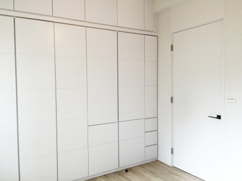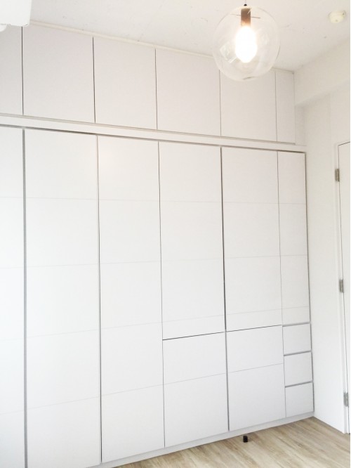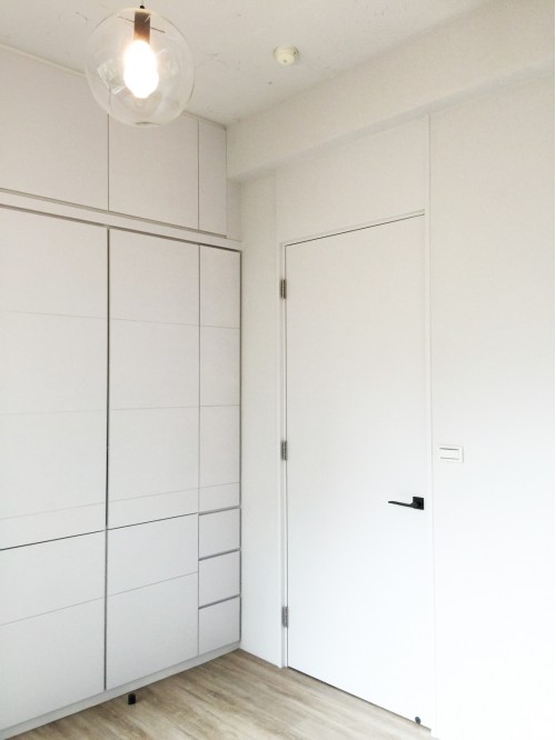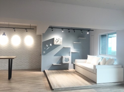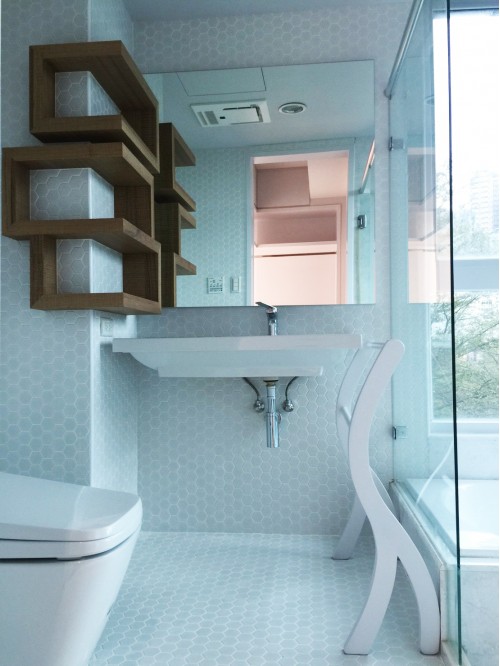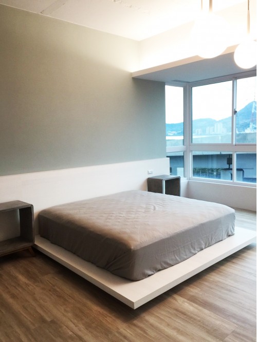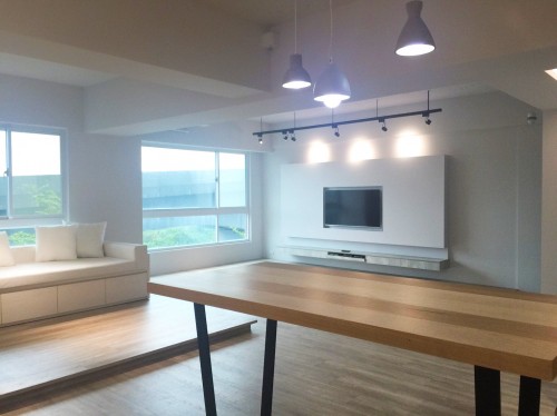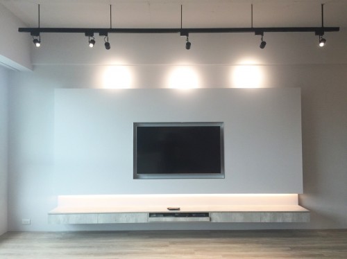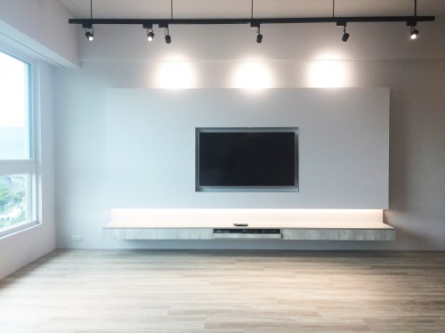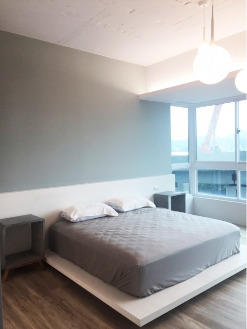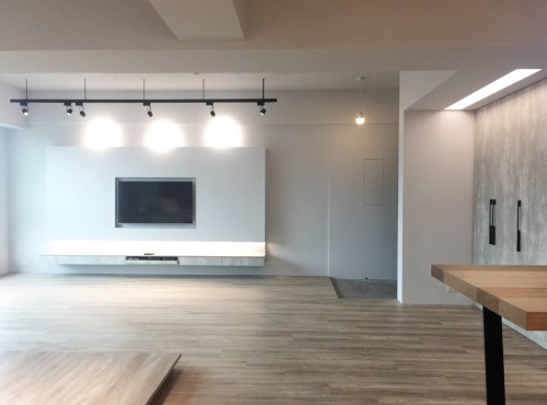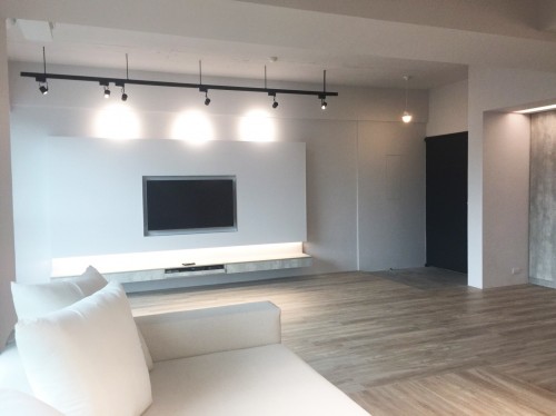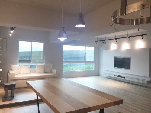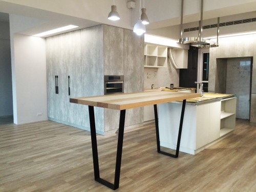 榆木耐磨木地板、噴漆-灰藍、烤漆玻璃、鋼刷橡木板、不銹鋼黑烤鐵件、六角磚、文化石二丁掛、柚木實木拼